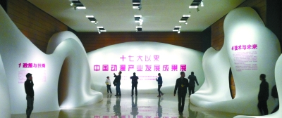 十七大以来,中国原创动漫涌现出了以“喜羊羊与灰太狼”“张小盒”等为代表的一批品牌。2011年7月29日,文化部、国家广电总局、新闻出版总署联合启动了“2011国家动漫精品工程”,最终评出37个动漫产品和40个动漫创意,涵盖了动画电影、动画电视、漫画、动漫出版物、动漫演出、新媒体动漫、动漫形象等动漫产业中各主要环节。该展厅以“2011国家动漫精品工程”为基础,展出了中国原创动漫的众多品牌产品。此外,还以漫画、动画、动漫衍生品、动漫教育几大板块完整展示了中国动漫的产业链。