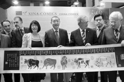 图为中国代表团向巴塞罗那国际动漫节组委会赠送五牛图