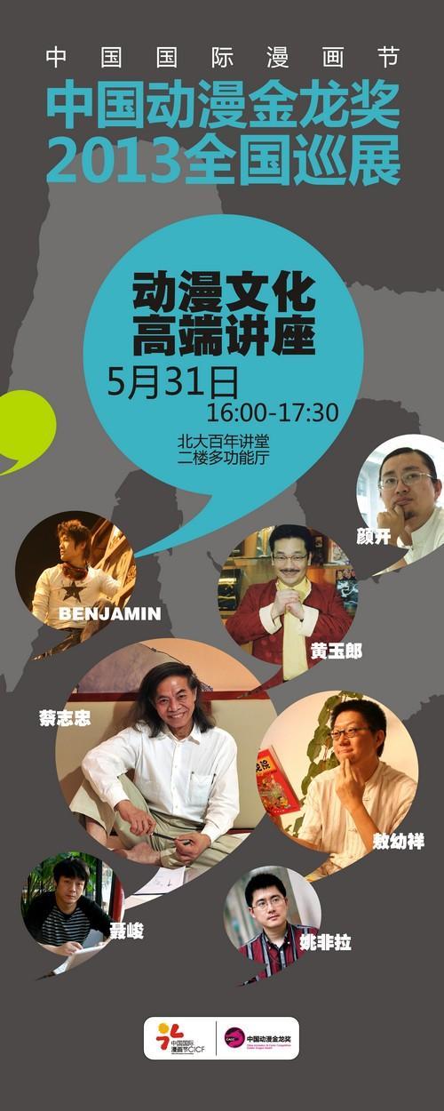 据了解,将于当天下午16时在百年讲堂二楼多功能厅举办的“动漫文化高端讲座”,系“非凡10年•中国动漫金龙奖”2013全国巡展(北大站)的组成部分,届时几位漫画大师将围绕“见自己、见天地、见众生——漫画家的成长之路”这一主题,轮番登场,以漫画创作为由头,为北大学子启迪人生,分享智慧。同时动漫内容开发与运营专家金城也将和国内著名漫画家本杰明、姚非拉、颜开、聂峻等展开对谈。