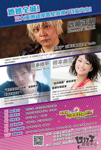 2013年7月12日~ 15日,第四届广州萤火虫动漫游戏嘉年华展会将于琶洲保利世贸博览馆1.2号开幕。本届萤火虫请来了三位亚洲巨星级动漫歌手——实力新星喜多修平,治愈歌姬桥本美雪,狮子王远藤正明。购买了见面会VIP门票及专辑CD的粉丝,在见面会结束后都可以活动歌星的现场亲笔签名一个。凡购买见面会VIP门票和专辑CD,都能参加现场抽奖,有机会获得明星签名T恤一件。