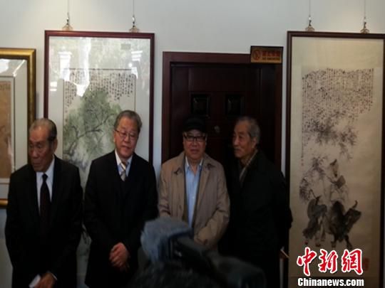 图为海派知名画家韩敏(左一)、上海文史馆馆长沈祖炜(左二)等在展览现场。 许婧 摄