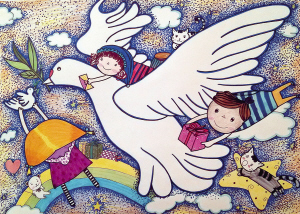 所梦,所想,所画。画中男孩女孩依偎着和平鸽,传递着“正能量”。运用“点”将画面渲染,突出了人物,很聪明。