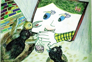 视角很独特,画的是给小鸟喂食,却从小鸟的视角展现,对比很有戏剧性。 |