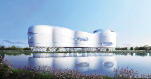 从外观上看,中国动漫博物馆宛如一朵漂浮在白马湖上的祥云。白色的建筑外表皮由总面积1.6万平方米的双曲面铝板组成,呈现出高低起伏、圆润流畅的自然形态。借鉴中国传统民居“亮瓦”的形式,在建筑表面设置了4个圆形采光天窗和6个椭圆形的“动漫眼”,通过太阳能百叶动态调整光照。博物馆一层为架空悬挑设计,入口大厅与滨湖景观连成一片。40米高的屋顶还有一个动漫主题的空中花园,从这里可以鸟瞰白马湖两千余亩湖岛的秀丽风光。